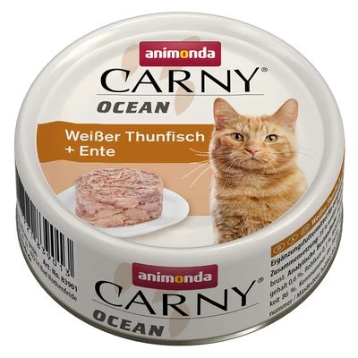 Animonda Carny Ocean es una comida para gatos envasada en la exclusiva lata «porción para gourmets». Filetes de atún y salmón enriquecidos con un sabroso acompañamiento. Con proteínas y aminoácidos.