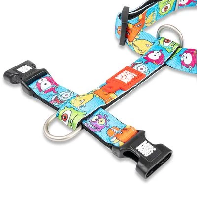 Arnés para perros ajustable en 4 posiciones. De neopreno y poliéster, muy resistente, estructura de 2 capas. Con 2 anillas semicirculares y cierres de clic extrafuertes. Diseño: pequeños montruos.