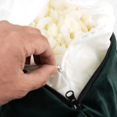 El relleno de la almohada reversible apoya y alivia la presión y está compuesto por espuma y copos de espuma viscoelástica que se adaptan a la forma del cuerpo y favorecen un sueño reparador y sin dolor.