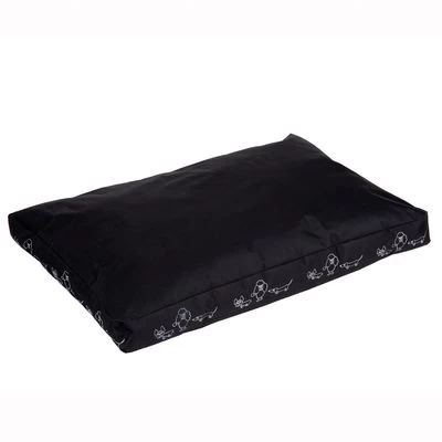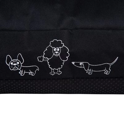 Colchón para perros resistente y con acolchado grueso. Apropiado para interiores y exteriores en zona protegida. Con puntos antideslizantes en la parte inferior. Repele la suciedad y es de color negro con dibujos en blanco.