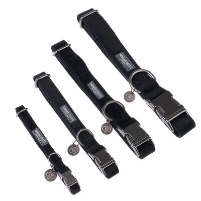 Collar de ajuste libre para perros, tacto aterciopelado y con detalles metálicos negro mate, resistente a la intemperie, gran anilla semicircular, correa a juego disponible, poliéster y nylon