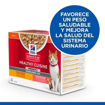 Hill’s Science Plan Adult Sterilised Healthy Cuisine con pollo y salmón es un alimento húmedo para gatos jóvenes esterilizados y castrados, que puede ayudar a mantener su peso ideal.