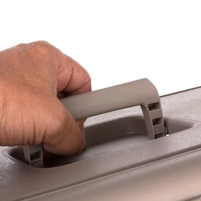 - Materiales: Caja de transporte: plástico reciclado (PP, polipropileno); Rejilla: acero (con recubrimiento de polvo de poliéster epoxi).