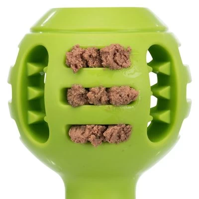 Las ranuras laterales son perfectas para rellenar con cremas o patés, que tu perro podrá sacar lamiendo. Lamer tiene un efecto calmante y puede ayudar a tranquilizar al perro. Gracias a la ventosa de la base, el juguete se puede fijar fácilmente en superficies lisas.