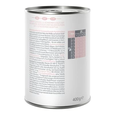 Comida húmeda para perros con receta 100 % sin cereales y con bayas, raíces y hierbas silvestres, contribuye a la digestión y es perfecta para perros que sufren intolerancia o alergia a los cereales.